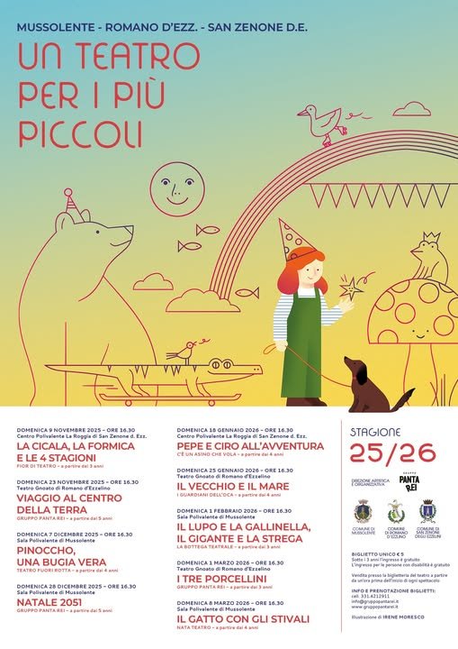 centro noi Mussolente via roma 14, Mussolente, ItalyDomenica 1 Febbraio ore 16.30Β Sala Polivalente - Mussolente (in via Roma a fianco della Chiesa di Mussolente) Spettacolo:Β IL LUPO E LA GALLINELLA, IL GANTE E LA STREGA La bottega tetrale Una gallinella ha la meglio su un lupo, che cerca diΒ sopraffarla e di toglierle la sua casetta per darla alla strega autrice di […]
